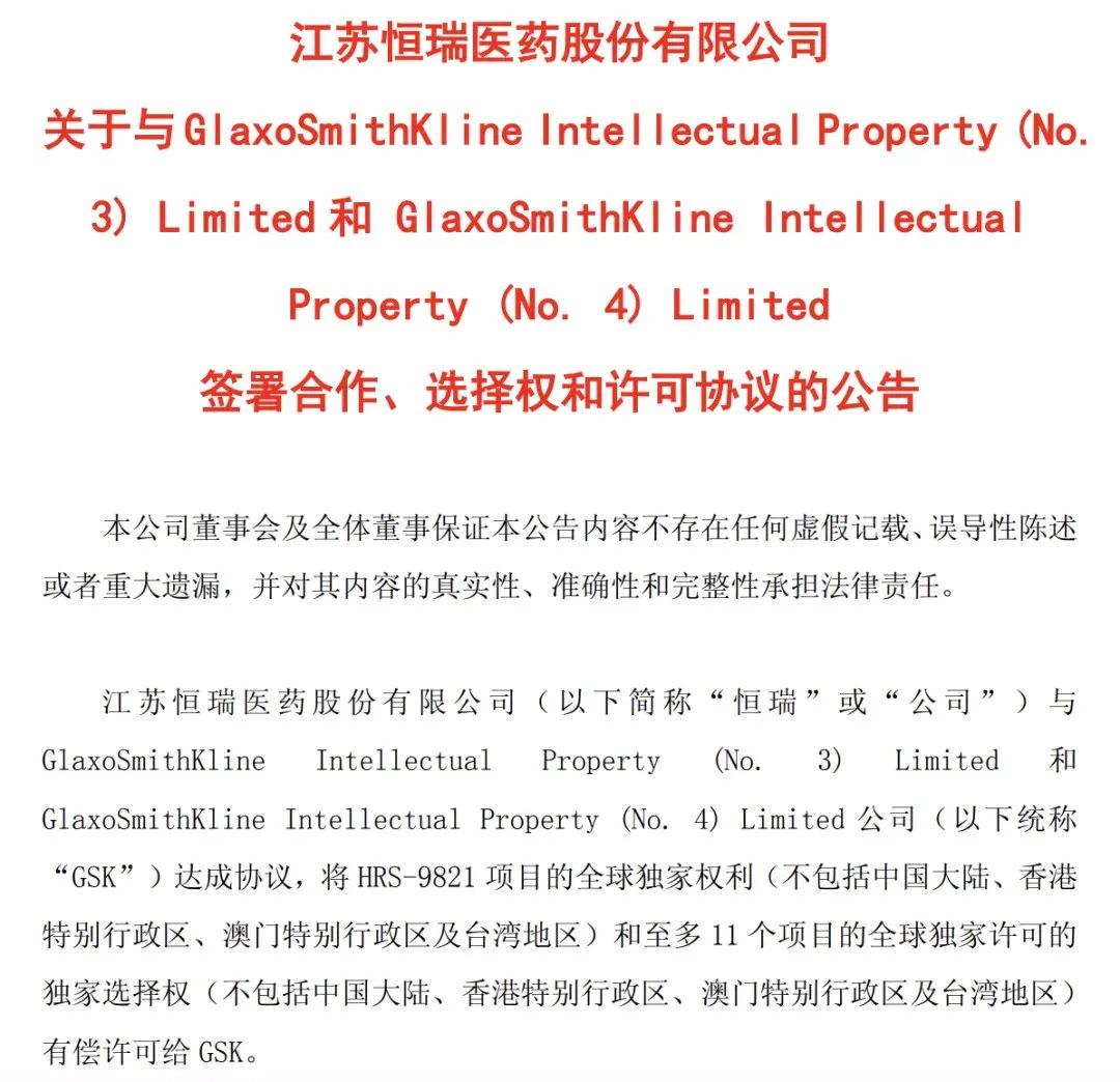 从交易本身来看,恒瑞医药将HRS-9821项目的全球独家权利(不包括中国大陆、香港特别行政区、澳门特别行政区及中国台湾地区)和至多11个项目的全球独家许可的独家选择权(不包括中国大陆、香港特别行政区、澳门特别行政区及中国台湾地区)有偿许可给GSK。GSK向恒瑞医药支付5亿美元首付款,如果所有项目均获得行使选择权且所有里程碑均已实现,恒瑞将有资格获得未来基于成功开发、注册和销售里程碑付款的潜在总金额约120亿美元。这样的巨额交易,乍一看无疑是恒瑞医药的重大胜利,彰显了其创新药研发实力获得国际认可。