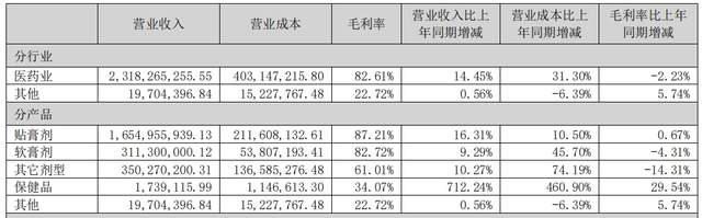 2024年,膏药剂产品实现营收16.55亿元,同比增长16.31%;软膏剂产品实现营收3.11亿元,同比增长9.29%;其他剂型产品实现营收3.50亿元,同比增长10.27%;保健品实现营收0.017亿元,同比增长712.24%。另有部分其他产品实现营收0.20亿元,同比增长0.56%。