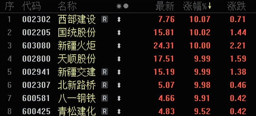 从盘面表现看,8月11日,新疆板块、水泥板块早盘走强。截至中午收盘,西部建设、国统股份、新疆火炬、天顺股份等多只个股涨停。