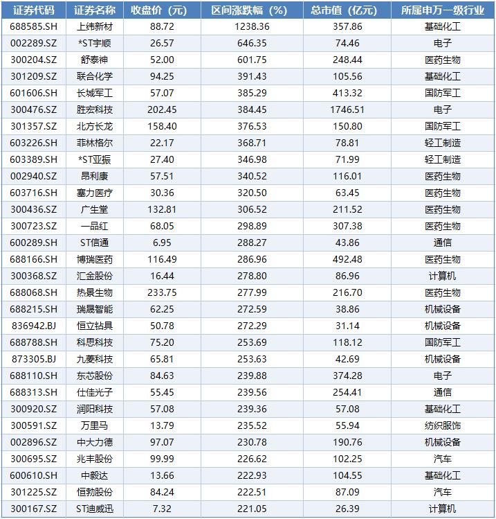 具体来看,截至8月11日收盘,上纬新材(688585.SH)今年累计上涨1238.36%,排在个股涨幅榜榜首。*ST宇顺(002289.SZ)、舒泰神(300204.SZ)紧随其后,分列第二、三位,今年以来累计涨幅分别为646.35%、601.75%。排在第四至第十位的分别是联合化学(301209.SZ)、长城军工(601606.SH)、胜宏科技(300476.SZ)、北方长龙(301357.SZ)、菲林格尔(603226.SH)、*ST亚振(603389.SH)、昂利康(002940.SZ),这些个股累计涨幅均超过300%。
