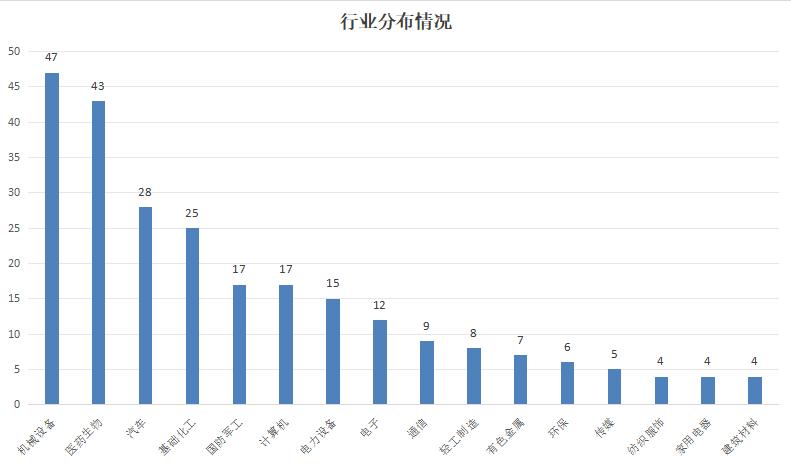 从行业分布来看,机械设备、医药生物、汽车、基础化工、国防军工企业数量较多,分别达到47家、43家、28家、25家、17家。