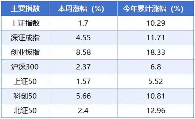 本周(8月11日至8月15日),A股三大指数全线飘红。截至周五收盘,上证指数累计上涨1.7%,深证成指累计上涨4.55%,创业板指累计上涨8.58%。