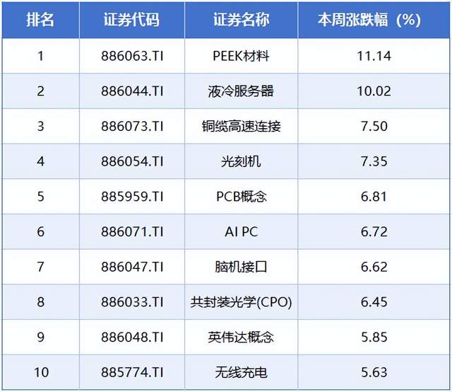 板块方面,本周涨幅居前的概念板块分别是PEEK材料、液冷服务器、铜缆高速连接、光刻机、PCB概念,累计涨幅分别为11.14%、10.02%、7.50%、7.35%、6.81%。