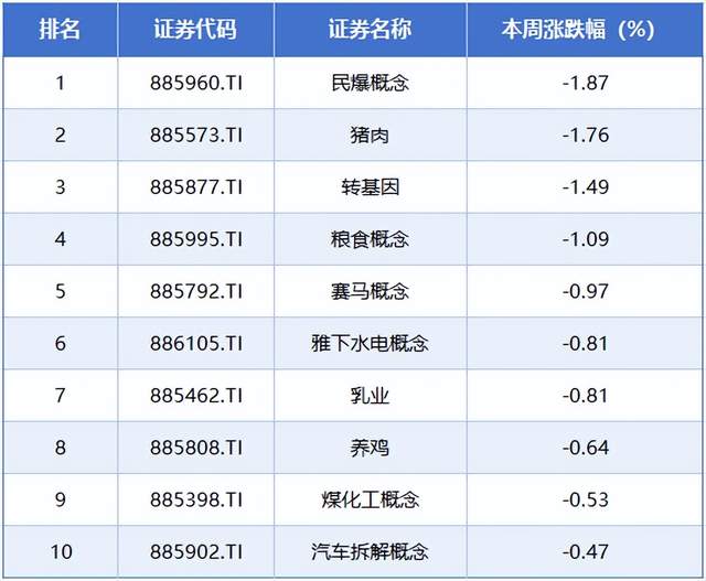 本周排在跌幅榜前排的概念板块分别是民爆概念、猪肉、转基因、粮食概念、赛马概念,累计跌幅分别为1.87%、1.76%、1.49%、1.09%、0.97%。