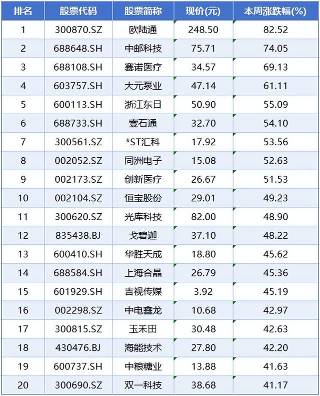 个股方面,本周个股涨幅榜前五位分别是欧陆通、中邮科技、赛诺医疗、大元泵业、浙江东日,累计涨幅分别为82.52%、74.05%、69.13%、61.11%、55.09%。