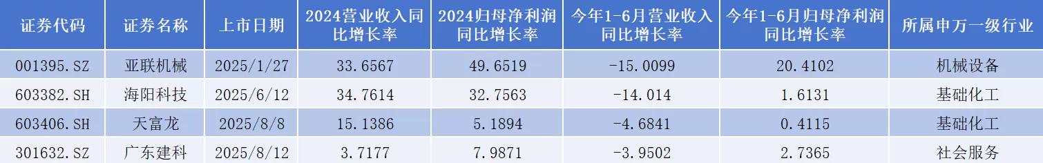 仅营收收入出现同比下滑的企业有4家,分别是亚联机械(001395.SZ)、海阳科技(603382.SH)、天富龙(603406.SH)、广东建科(301632.SZ)。