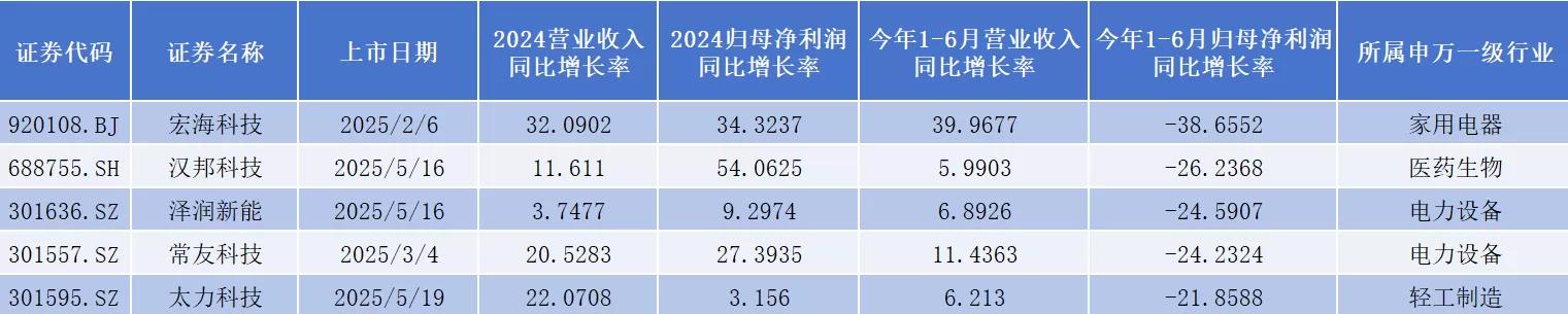 从上半年业绩表现看,在今年上市的67只新股中,弘景光电(301479.SZ)、影石创新(688775.SH)2家公司营业收入同比增长超过50%;广信科技(920037.BJ)、泰禾股份(301665.SZ)2家公司归母净利润同比增长超过50%。
