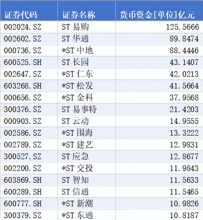 其他ST公司当中,ST华通、*ST中地、ST长园、*ST仁东、*ST松发、*ST金科、ST易事特、ST云动、*ST围海、*ST建艺、ST应急、*ST交投、ST智知、ST信通、*ST新潮、*ST东通,加上ST易购,共有17家ST公司在手货币资金金额均超10亿元。
