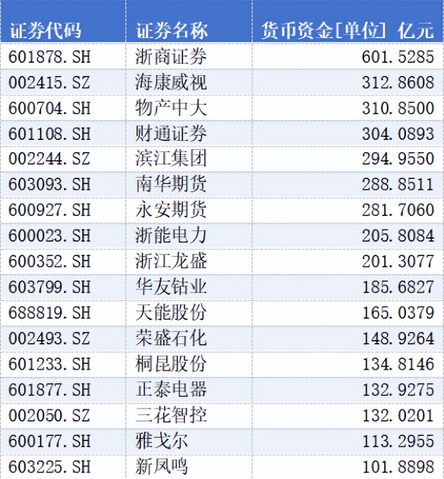 根据同花顺数据,浙商证券是浙江省货币资金金额最多的公司,为601.53亿元。其次,海康威视、物产中大、财通证券、滨江集团、南华期货、永安期货、浙能电力、浙江龙盛、华友钴业、天能股份、荣盛石化、桐昆股份、正泰电器、三花智控、雅戈尔、新凤鸣的货币资金均超过100亿元。