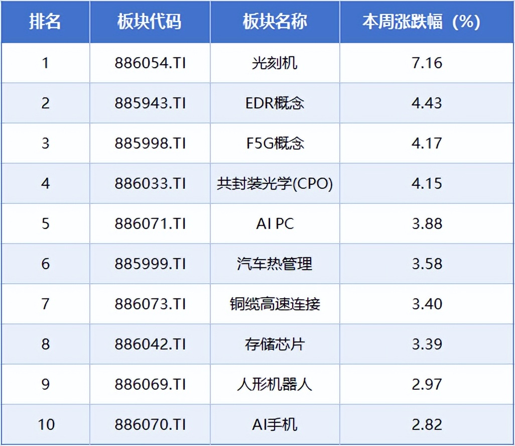 板块方面,本周涨幅居前的概念板块分别是光刻机、EDR概念、F5G概念、共封装光学(CPO)、AI PC,累计涨幅分别为7.16%、4.43%、4.17%、4.15%、3.88%。