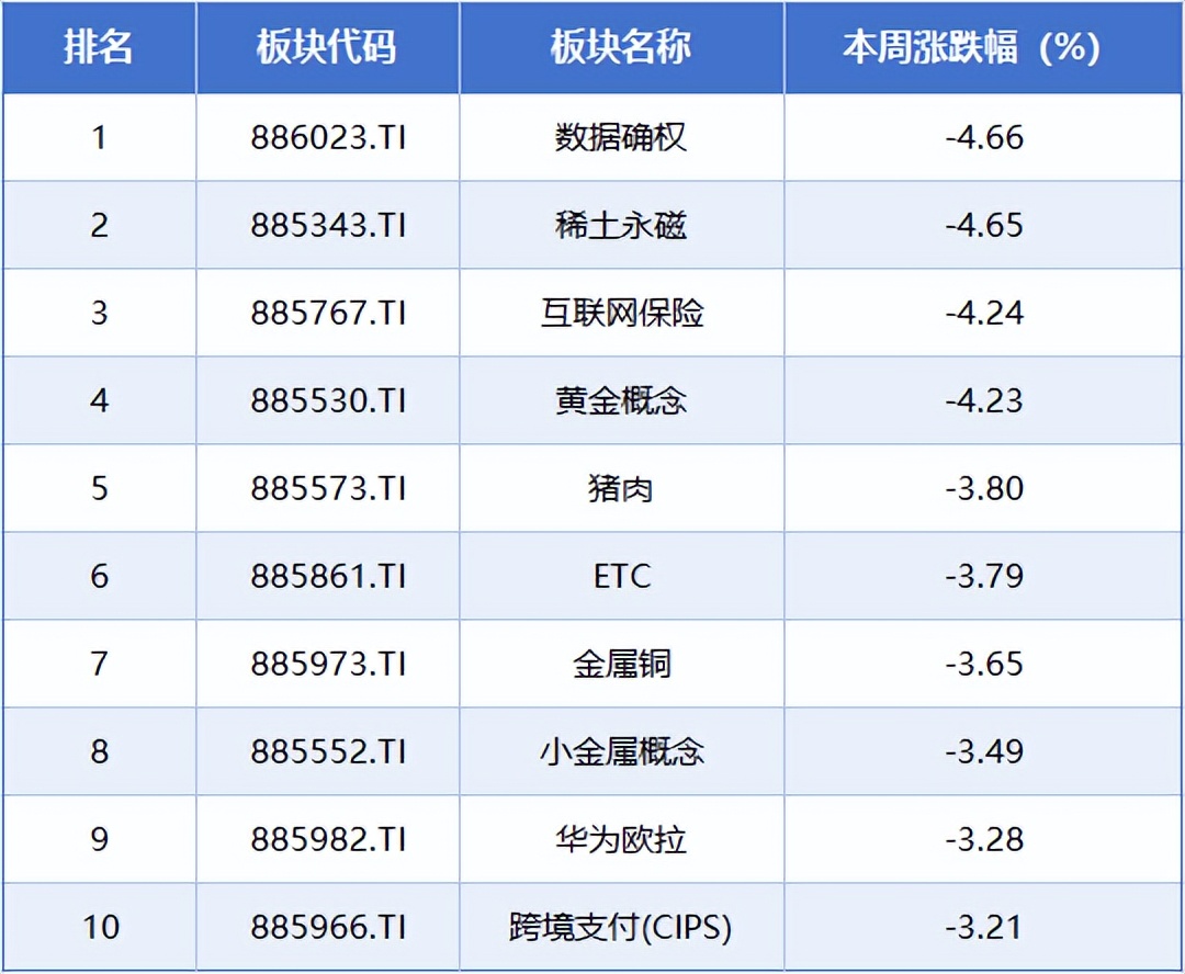 本周排在跌幅榜前排的概念板块分别是数据确权、稀土永磁、互联网保险、黄金概念、猪肉概念,累计跌幅分别为4.66%、4.65%、4.24%、4.23%、3.8%。