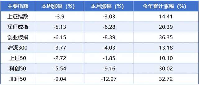 本周(11月17日至11月21日),A股三大指数迎来大幅调整。截至周五收盘,上证指数累计下跌3.9%,深证成指累计下跌5.13%,创业板指累计下跌6.15%。