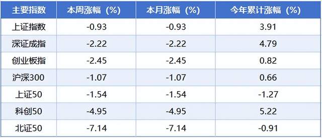 本周(3月2日至3月6日),A股三大指数以调整为主。截至周五收盘,上证指数累计下跌0.93%,深证成指累计下跌2.22%,创业板指累计下跌2.45%。