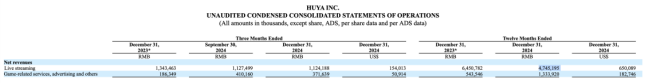 财报显示,虎牙2024年营收为60.8亿元,同比下滑13%;非美国通用会计准则下,公司2024年实现净利润为2.69亿元,同比增长125.3%。其中,公司在第四季度实现营收14.96亿元,同比下滑2.22%,已连续13个季度同比出现下滑;非美国通用会计准则下,公司在该季度实现扭亏,净利润为120万元。