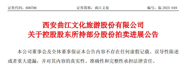 同日,曲江文旅发布的另一则公告称,因与的债务诉讼问题,将于2025年11月3日10时—11月4日10时止(延时除外)在司法拍卖平台对公司控股股东曲江旅投持有的1035.8215万股(占公司总股本4.06%)进行公开拍卖,起拍价8231.052万元。目前该部分股份处于冻结状态。