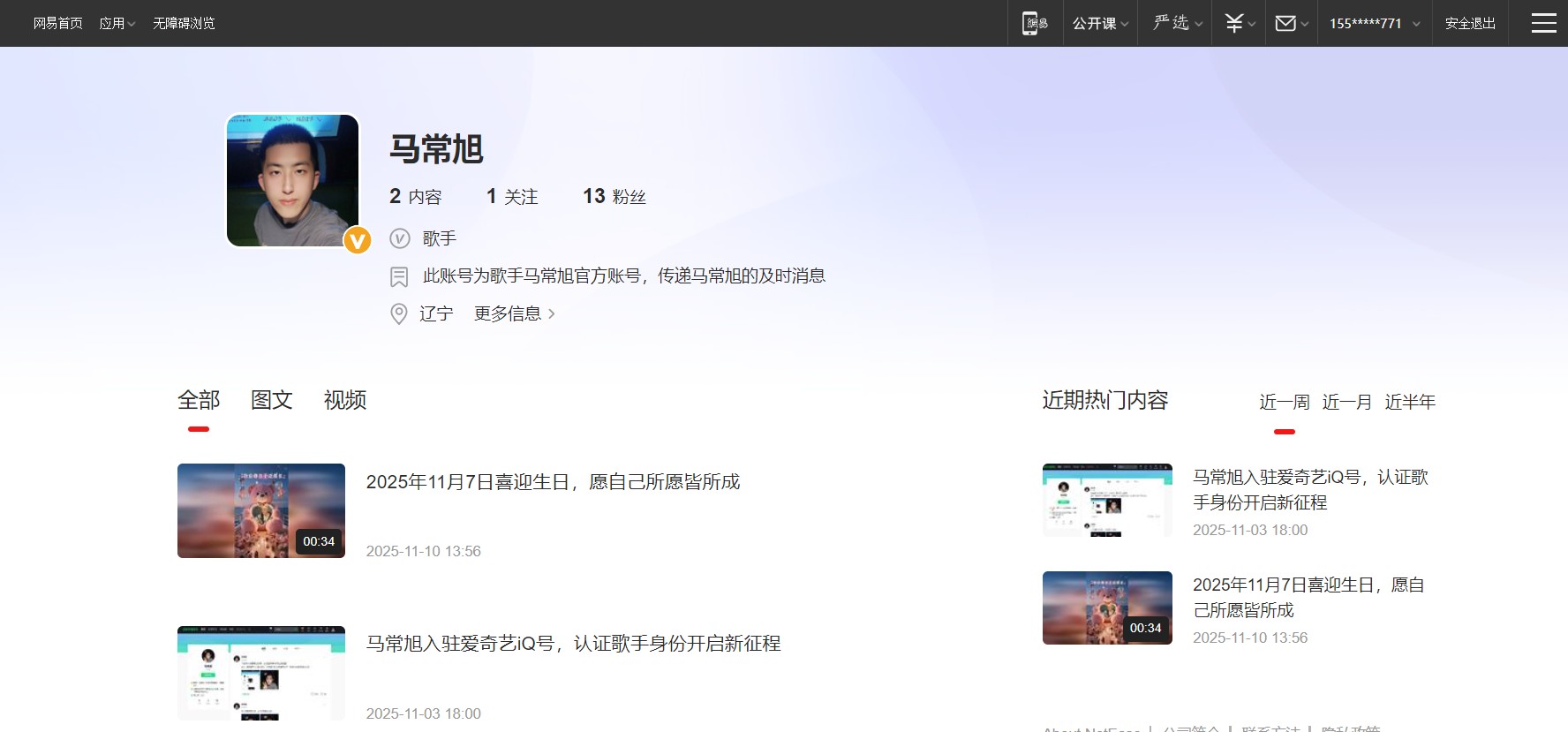 2025年11月10日,据网易新闻客户端显示,马常旭已认证为歌手,并发布入驻动态信息。