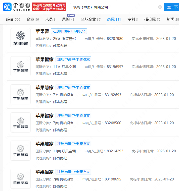 企查查APP显示,近日,苹果(中国)有限公司申请注册多枚苹果智家、苹果慧家、苹果爱家、苹果花等商标,国际分类涉及服装鞋帽、灯具空调、机械设备等,当前商标状态为注册申请中。资料显示,苹果(中国)有限公司由美国苹果集团全资持股。