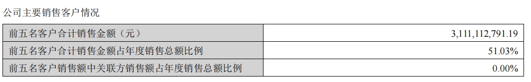 财报数据显示,2024年,意华股份前五名客户合计销售金额约为31.11亿元,前五名客户合计销售金额占年度销售总额比例为51.03%。
