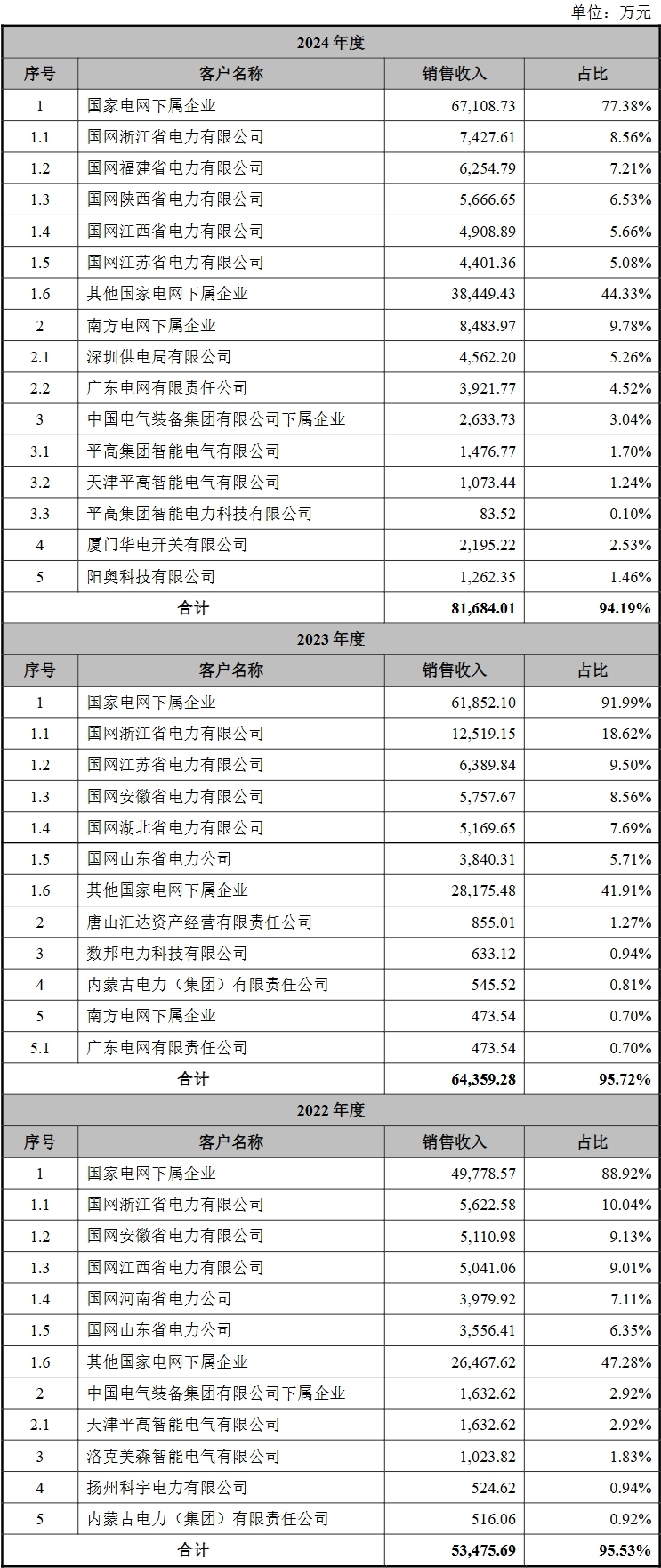 2022-2024年,公司对国家电网下属企业的销售收入分别为49,778.57万元、61,852.10万元和67,108.73万元,占公司营业收入的比例分别为88.92%、91.99%和77.38%。