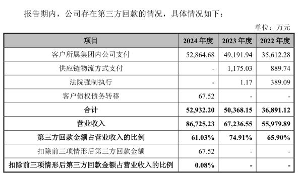 值得关注的是,2022-2024年,公司第三方回款金额较大,占同期营业收入的比例分别为65.90%、74.91%和61.03%。