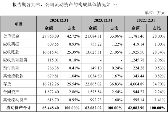 2022-2024年,公司的应收账款账面价值分别为11,925.50万元、13,625.31万元和16,615.41万元,占当期营业收入的比例分别为21.30%、20.26%和19.16%。
