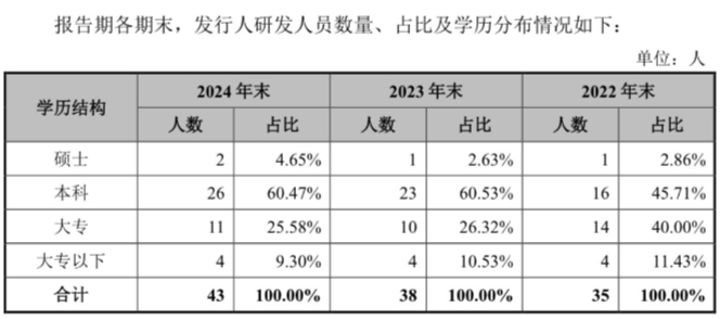 此外,公司研发人员数量远低于同行业可比公司。数据显示,在2024年末,昊创瑞通共有研发人员43名,占其员工总数比约在11.35%,2023年末和2022年末分别为38人和35人。