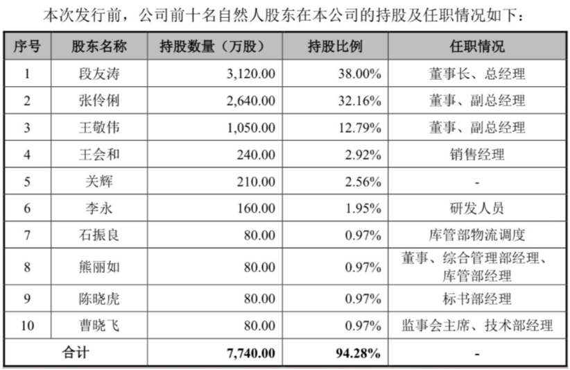 此外,在高管团队中,公司董事兼副总经理王敬伟持股12.79%,公司董事、综合管理部经理及库管部经理熊丽如,以及监事会主席、技术部经理均持股0.97%。