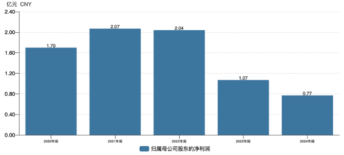 近年来,公司业绩持续承压,2023年及2024年连续两年出现营利双降的情况。相应报告期内,公司的营收分别为7.99亿元、7.37亿元,同比分别下滑14.43%、7.77%;归母净利润分别为1.07亿元、0.77亿元,同比分别下滑47.62%、28.27%。