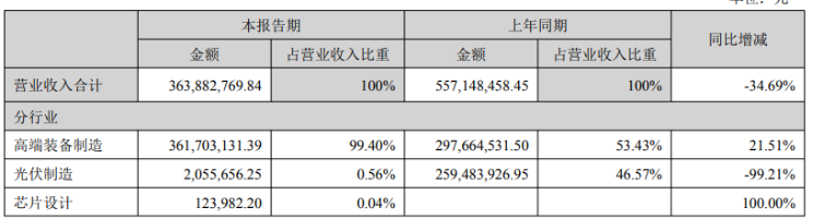 华东重机营收下滑主要是主营结构变动影响所致。数据显示,光伏制造板块上半年实现营收205.57万元,同比直降99.21%,营收占比也从去年同期的46.57%缩水至0.56%。因此,高端装备制造板块的营收占比在上半年相应增长至99.4%,实现营收3.62亿元,成为最主要的收入来源。