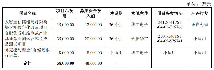 此次上市,华宇电子预计募集资金总额为40000万元,12000万元投入大容量存储器与射频模块封测数字化改造项目;20000万元投入合肥集成电路测试产业基地晶圆测试及芯片成品测试项目;8000万元用于补充流动资金(包括偿还银行借贷)。
