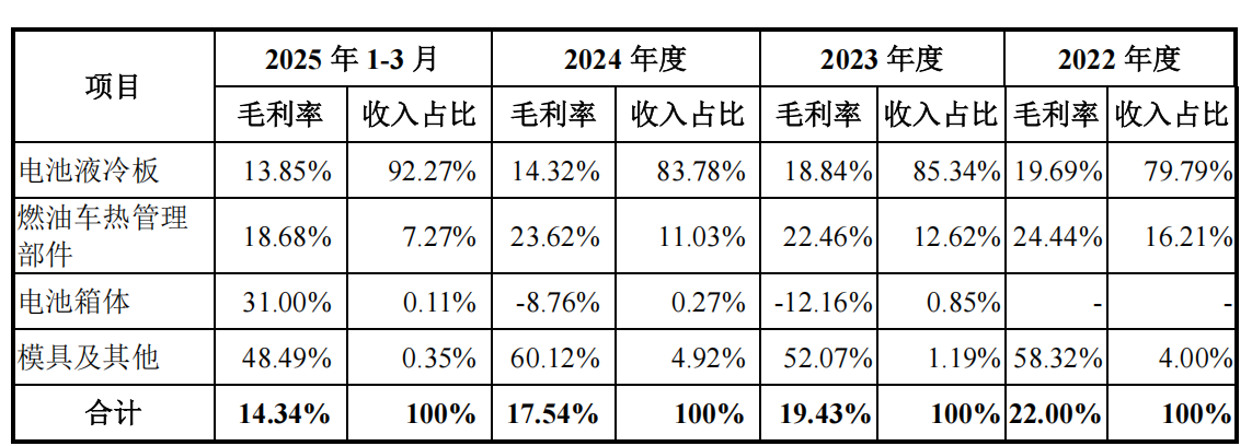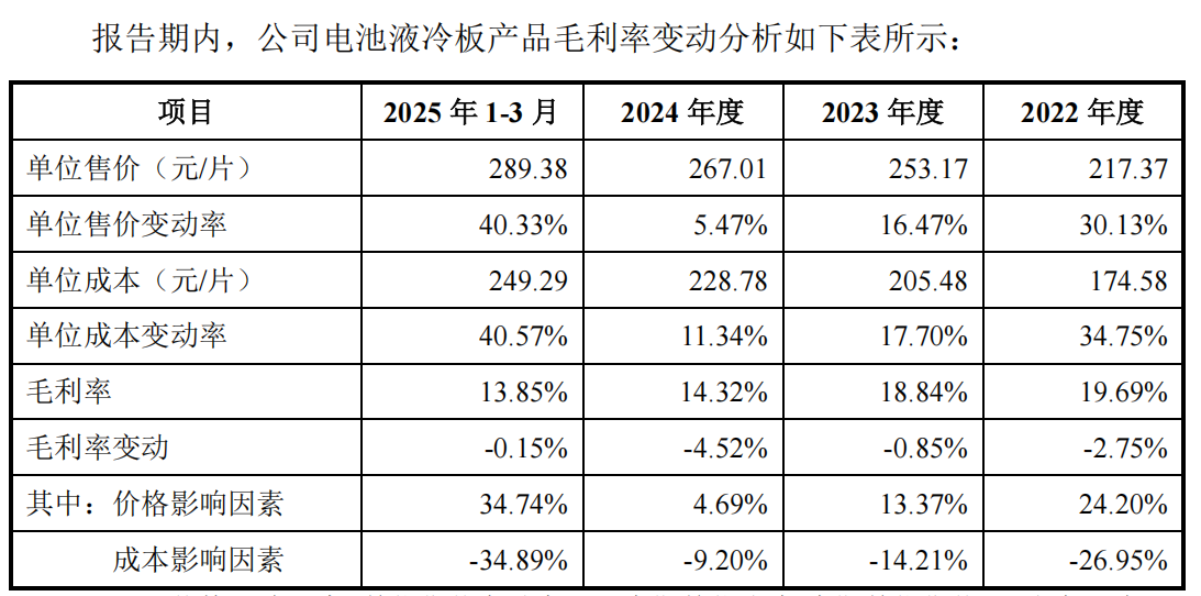 2023年度、2024年度、2025年1-3月,纳百川电池液冷板产品毛利率分别为19.69%、18.84%、14.32%、13.85%。虽然电池液冷板的平均售价持续上升,但是随着尺寸规格较大产品的销售占比增加,以及销售结构变动叠加新建产能的磨合、折旧摊销,导致电池液冷板的单位成本上升更快。