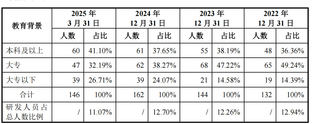 截至2025年3月31日,公司从事技术和研发相关的人员为146人,占公司员工总人数的11.07%。从教育背景看,大专及以下占比近六成。