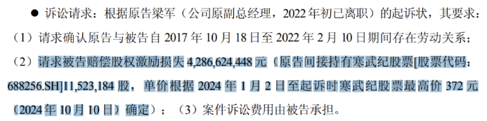 需要指出的是,梁军所主张的股权激励损失金额,是基于其间接持有的1152.32万股寒武纪股票,并参照2024年1月2日至起诉期间公司股价最高点—即2024年10月10日的每股372元计算得出。