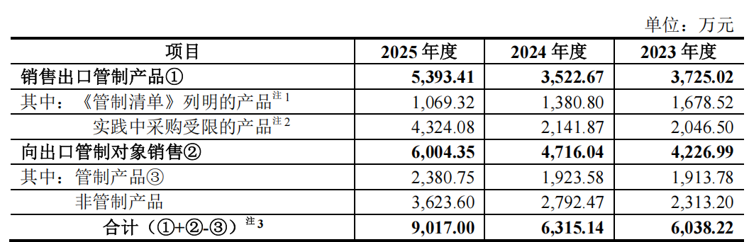 根据回复文件显示,长进光子销售管制产品以及向被管制企业销售产品两项合计,在2023年至2025年分别为6038万元以及6315万元以及9017万元,占到当年销售收入比例分别为58%、41%以及36%。