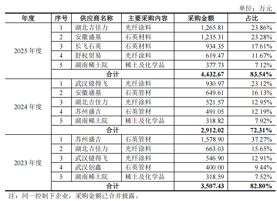《奕泽财经》注意到,长进光子原材料包括石英管材、光纤涂料、稀土化学品这三大类。这三类产品的供应商也比较集中。《招股书》显示,2023年至2025年,长进光子向前五大供应商采购金额占到总采购的82%、72%和83%,供应商集中特点很是明显。