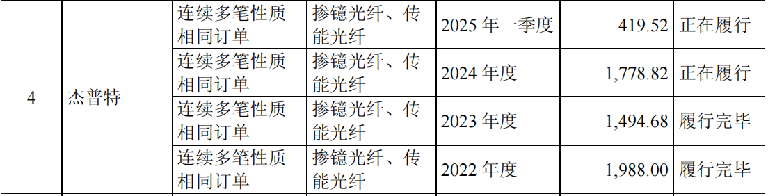 《招股书》显示,2023年,长进光子向杰普特销售金额为1494.68万元,而重大合同也列示了这一事项,履行情况显示未“履行完毕”。合同列示与大客户交易列示金额一致,不存在问题。