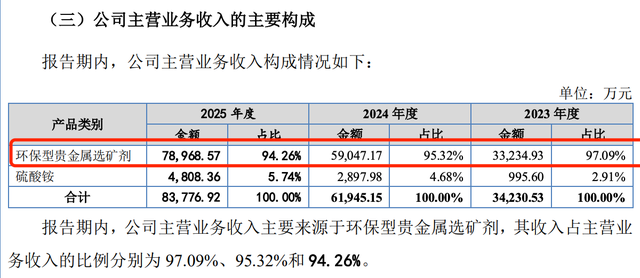 招股书显示,2023-2025年,森合高科环保型贵金属选矿剂收入占主营业务收入的比例分别为97.09%、95.32%和94.26%。尽管2023年公司新增了副产品硫酸铵,且2025年收入占比微升至5.74%,但这一占比远不足以形成有效支撑,本质上仍是“一条腿走路”的经营模式。