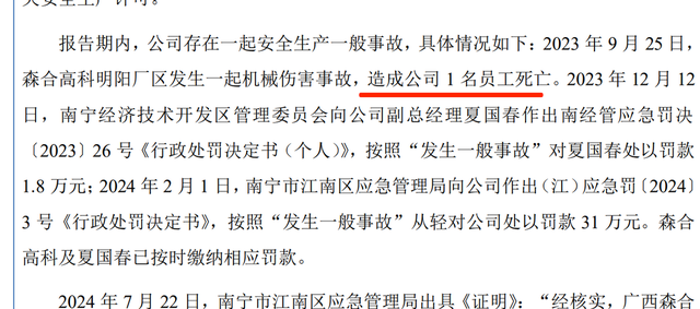 2023年9月25日,森合高科明阳厂区发生一起机械伤害事故,造成1名员工死亡。事故调查认定,公司未落实安全生产教育培训,未有效督促员工执行安全规章制度和操作规程,安全管理存在严重缺失。事后,公司被应急管理部门罚款31万元,分管副总经理夏国春被罚款1.8万元。