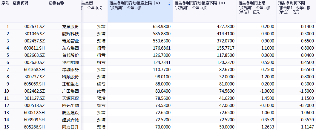 根据预告净利润变动幅度上限,龙泉股份、能辉科技、青龙管业、东方集团、普邦股份、华西能源、绿城水务有望实现翻倍。