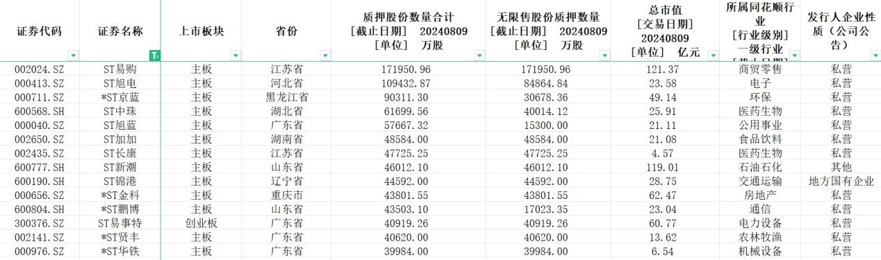 根据同花顺数据显示,存在股权质押的ST类公司共112家。其中,质押股份数量最高的为ST易购,质押数量为17.19亿股;其次为ST旭电,质押数量为10.94亿股,无限售股份质押数量为8.49亿股。