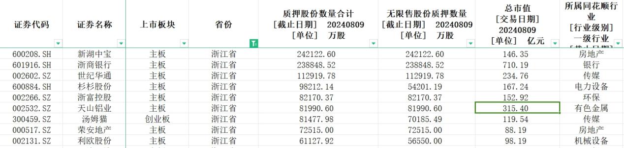 根据数据显示,新湖中宝质押股份数量最多,为24.21亿股,质押比例为28.46%;浙商银行排名第二,为23.88亿股,质押比例11.09%;第三名为世纪华通,质押股份数量为11.29亿股,质押比例15.15%,三者均为无限售股份。