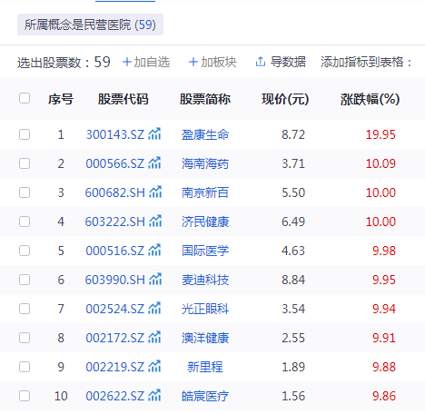 9月9日,民营医院概念逆势拉升,盈康生命、海南海药、南京新百、济民健康、国际医学、麦迪科技、光正眼科、澳洋健康、新里程等多只概念股大涨。