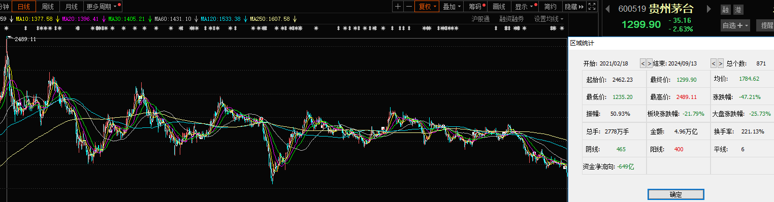 2024年5月初,贵州茅台的股价出现加速下跌。9月12日,其股价再次加速向下。截至9月13日中午收盘,贵州茅台下跌2.63%,报1299.90元/股,已经跌破1300元/股。自2022年11月以来,贵州茅台的股价创下近22个月新低。