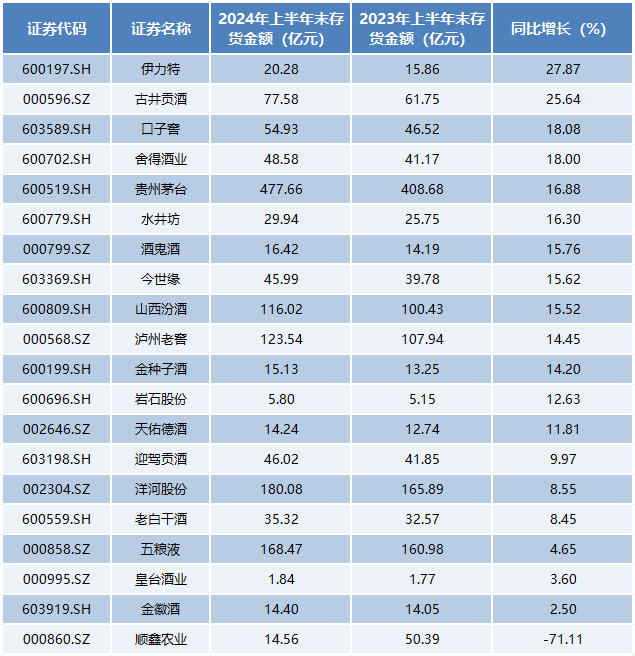 其中,存货金额超百亿的酒企共5家,分别是贵州茅台、山西汾酒、泸州老窖、洋河股份、五粮液。另有7家企业存货金额在30亿元至80亿元之间。此外,伊力特、古井贡酒等企业上半年存货增长较多,均同比增长超过20%。