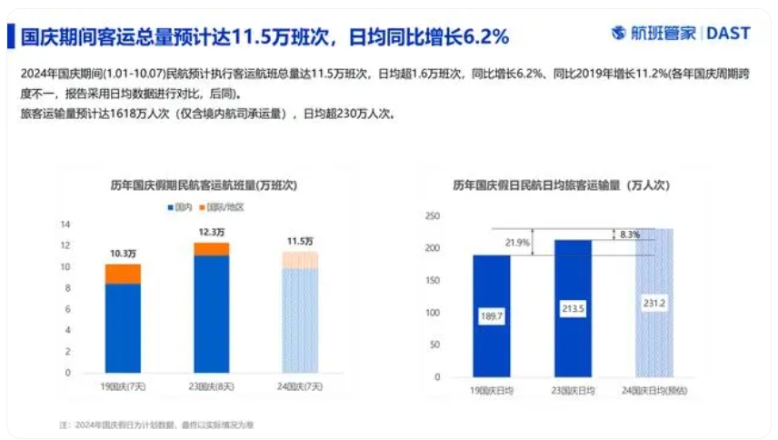 这个国庆节,旅游市场将迎来下半年最高峰。根据航班管家预测,国庆期间民航预计执行客运航班总量达11.5万班次,同比增长6.2%。同时,国内旅游出游人次达到2.95亿人次,同比增长7.6%。