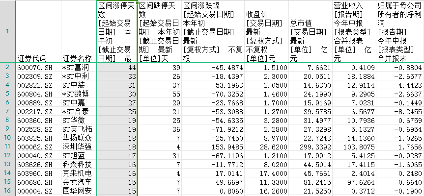 据览富财经观察,在华为概念板块中,今年以来区间涨停天数、区间跌停天数同时超过20天的有*ST富润、*ST中利、ST中装、*ST鹏博、ST中嘉、*ST合泰,清一色的ST股。炒作风波之后,悉数以下跌收场,有甚者跌幅超过70%