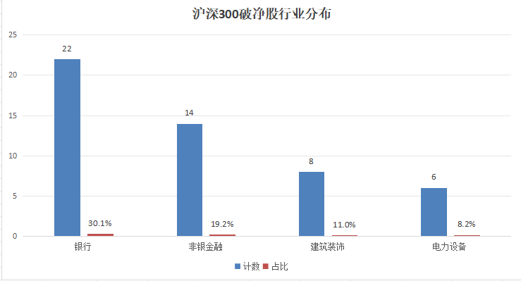 同花顺数据显示,截至9月25日收盘,沪深300指数成分股中,破净股有73家,占比24.3%。从行业分类看,较多聚集在银行、非银金融、建筑装饰和电力设备。