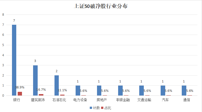 截至9月25日收盘,上证50指数成分股中,破净股有18家,占比36.0%。从行业分类看,银行有7家,建筑装饰有3家,石油石化有2家,电力设备、房地产、非银金融、交通运输、汽车、通信各有1家。