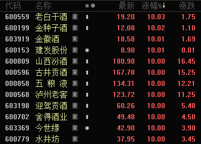个股方面,白酒股全线飘红,老白干酒、金种子酒、金徽酒、山西汾酒等10余只个股涨停,贵州茅台大涨9.29%。
