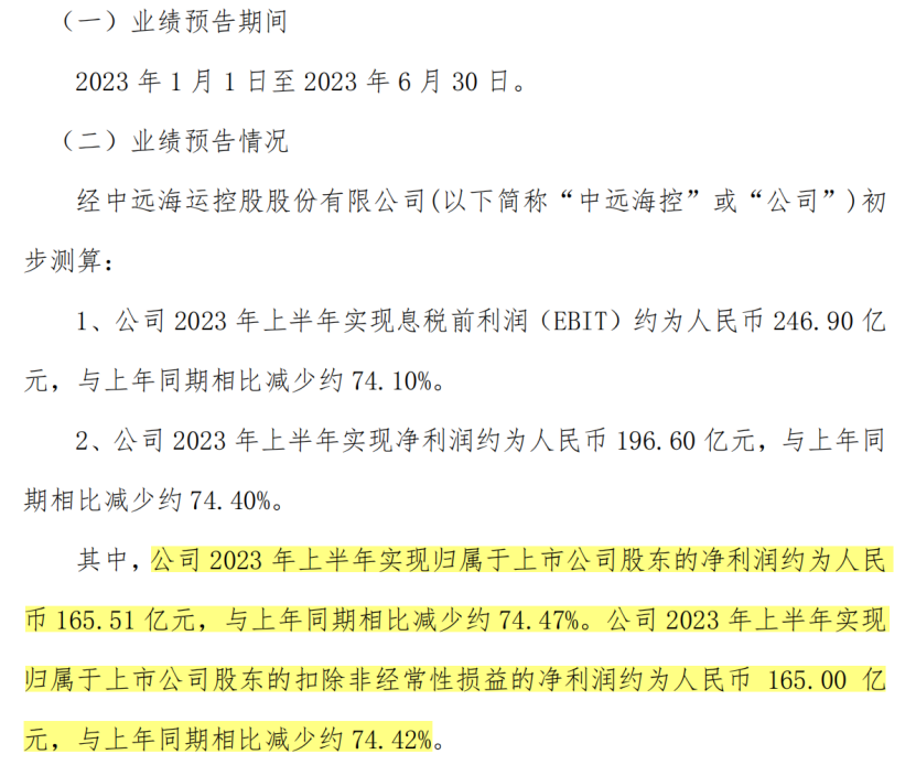 7月3日晚,中远海控发业绩预告。今年上半年,该公司息税前利润(EBIT)、归母净利润、扣非净利润分别为246.9亿元、165.51亿元、165亿元,同比跌幅均超过74%。